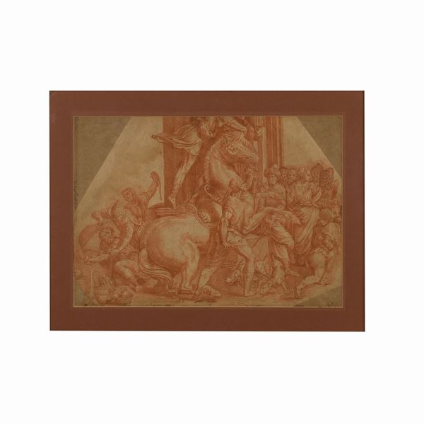 Antico disegno rinascimentale a sanguigna raffigurante cavallo imbizzarrito con personaggi.