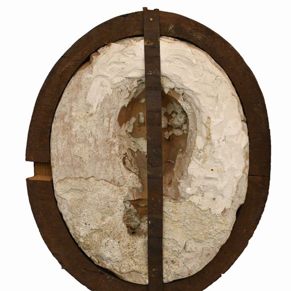 cm 40x30; coon cornice cm 49x44Altorilievo in terracotta a fondo oro ed in cornice lignea ovale a doppia modanatura.