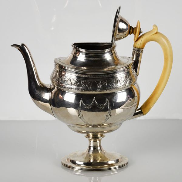 Caffettiera in argento sterling con manico e pomo in osso. Londra, 1871.