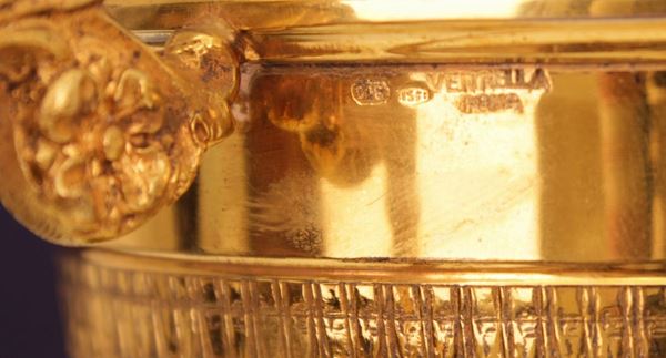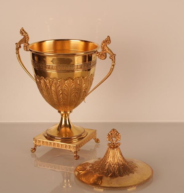 Calice in argento dorato 800/000 con coperchio finemente cesellato. Argentere Ventrella Roma