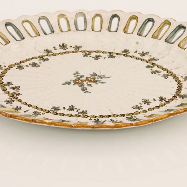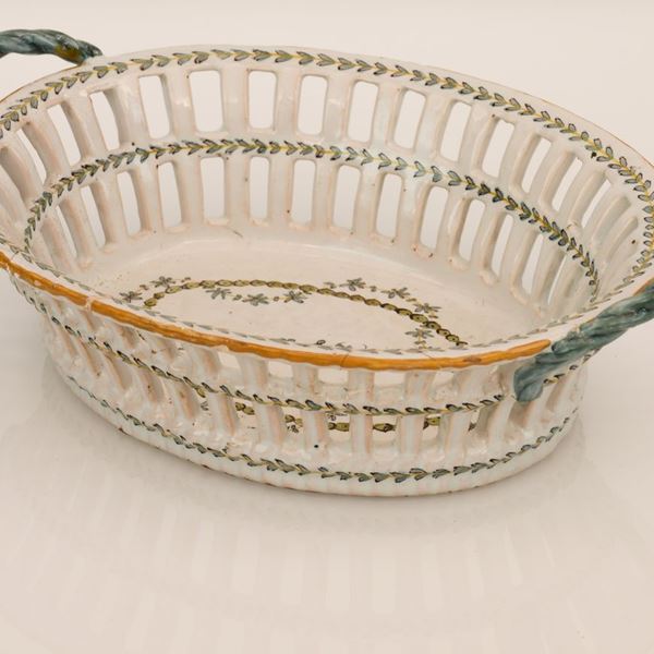 Cestello in maiolica traforato e dipinto a fiori con vasoio. Cerreto Sannita, XVIII secolo