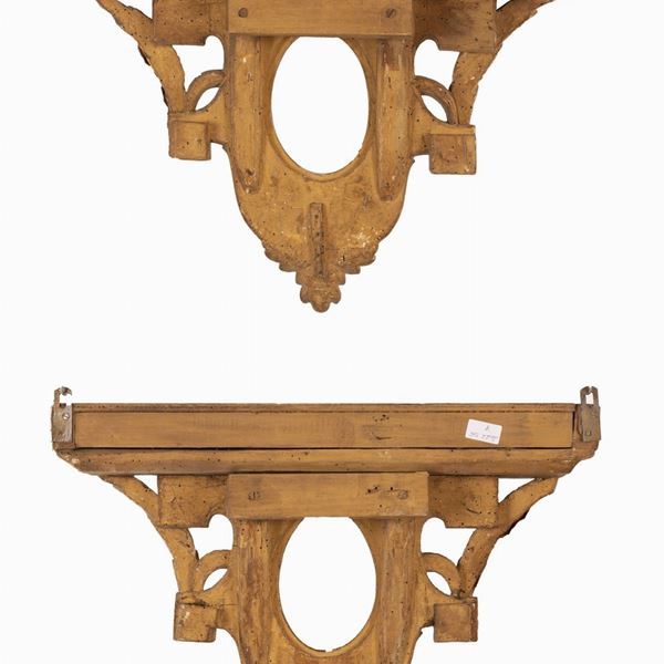 COPPIA DI PICCOLE MENSOLE IN LEGNO DORATO E INTAGLIATO A MOTIVI VEGETALI.
