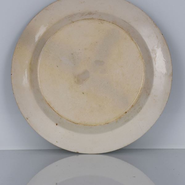 Piatto in porcellana dipinta decorato sulla tesa con fiorellini policromi e nel cavetto con soldato in uniforme e fucile in paesaggio. Epoca [..]