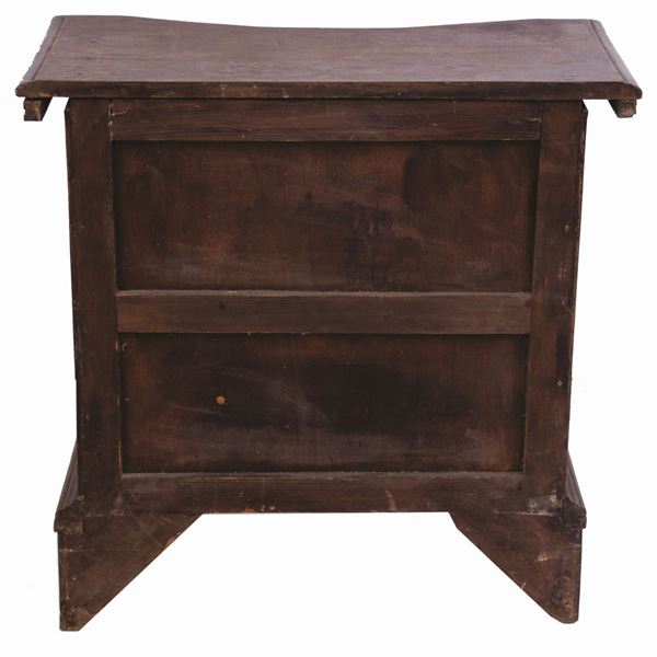 Piccolo comodino a due cassetti sul fronte in noce con intarsi in radica.