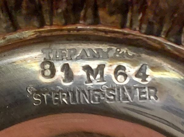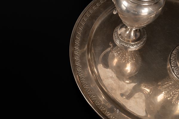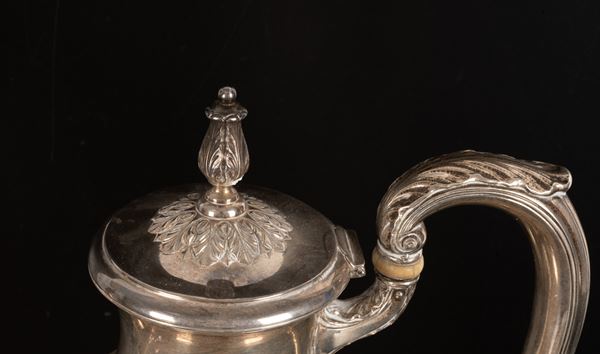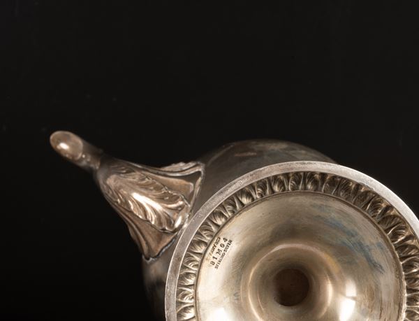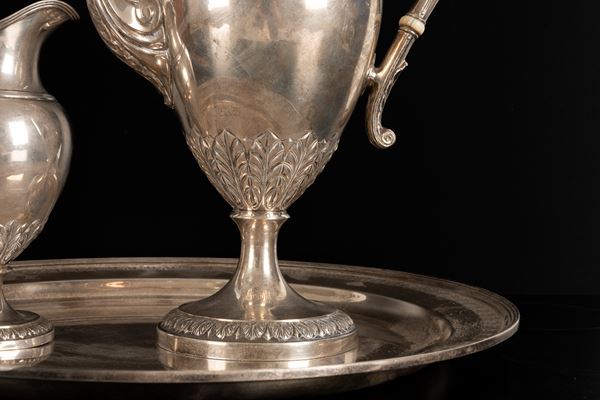 Servizio di caffettiera e lattiera con vassoio in argento Tiffany & Co. Delicata decorazione a palmette e volute.