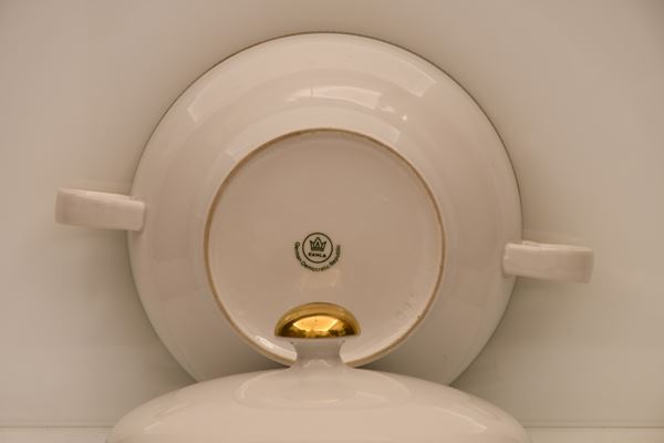 Composto da: 1 zuppiera con coperchio, 12 piattini, 11 piatti piani, 12 piatti fondi, 4 piatti piani grandi, 1 insalatiera, 1 piatto da portata, 1 piatto ovale da portata
