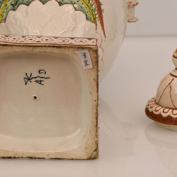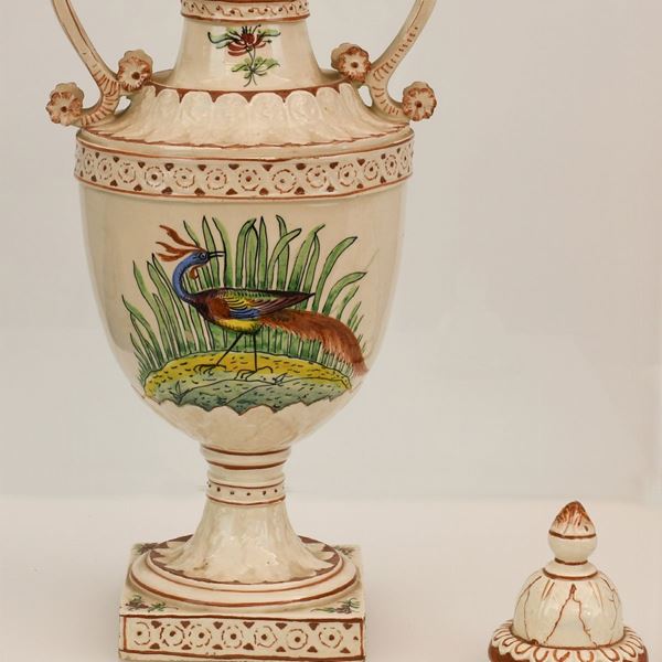 Vaso biansato in ceramica dipinta con motivi floreali in stile settecentesco. Decoro centrale policromo con pavone. Bassano, inizi del XX sec [..]