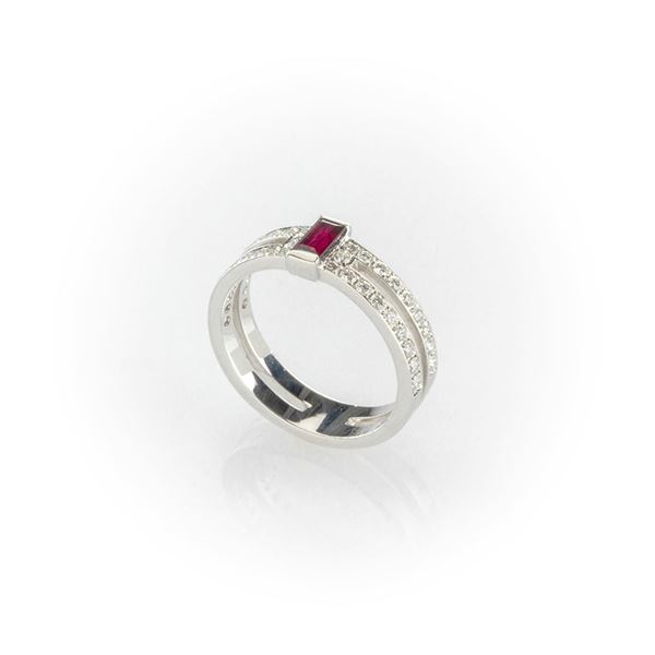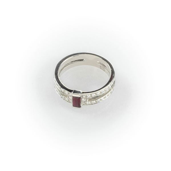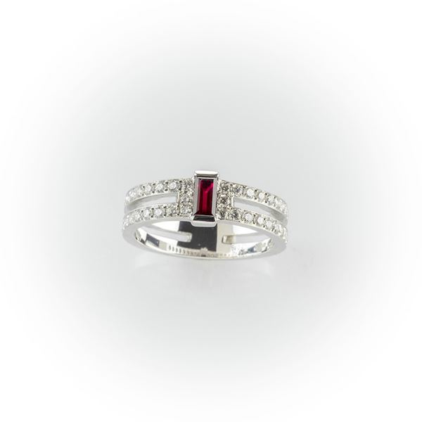 Anello a fascia in oro bianco con diamanti taglio brillante e rubino taglio baguette