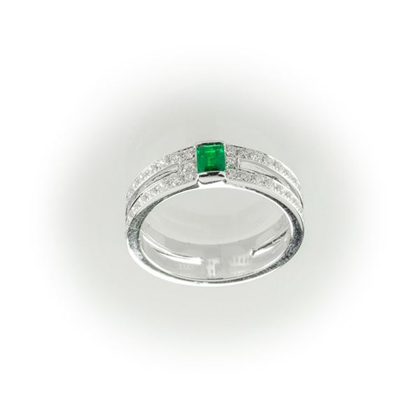 Anello a fascia in oro bianco con diamanti taglio brillante e smeraldo taglio baguette