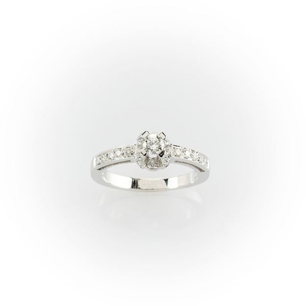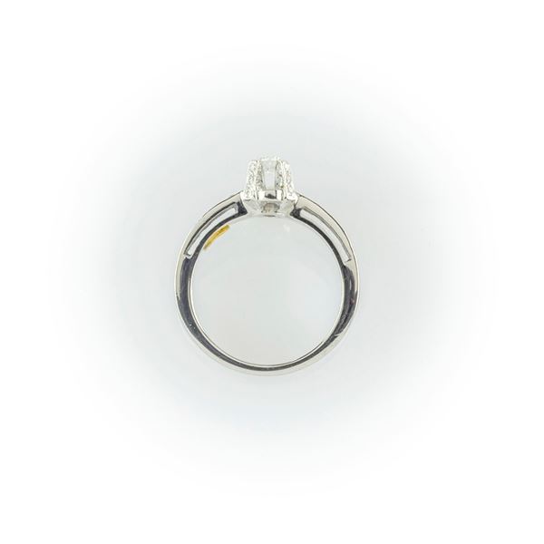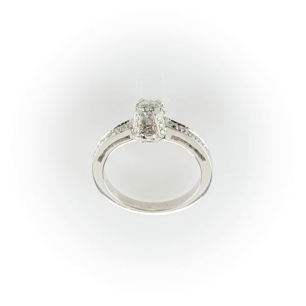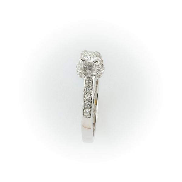 Anello in oro bianco con diamante centrale taglio brillante e pavè di diamanti laterale montato sul gambo