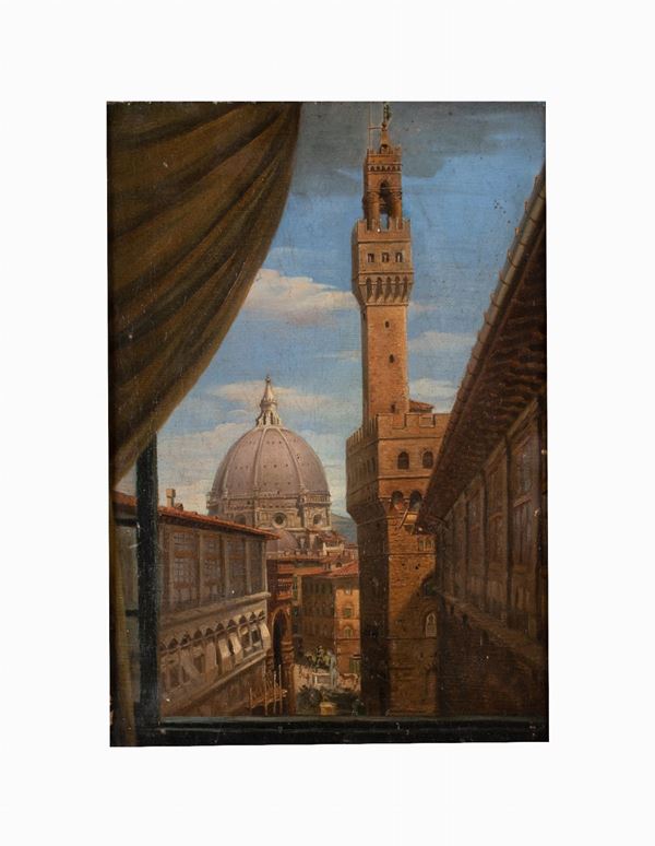 Veduta prospettica di Palazzo della Signoria e della cupola del duomo vista dalla tribuna degli Uffizi.