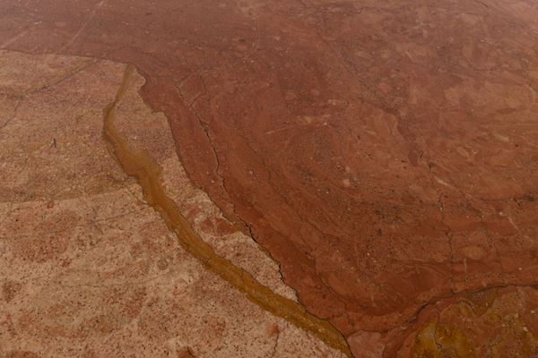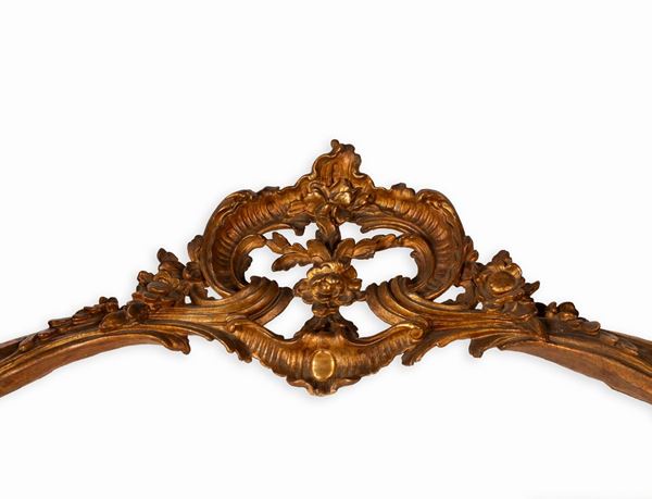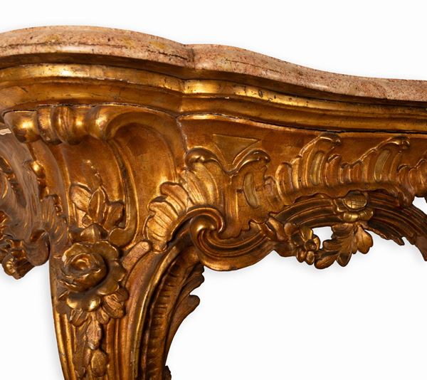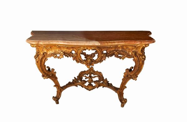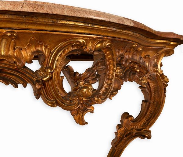 Consolle in legno dorato intagliato Luigi XV con piano in marmo rosso di Verona sagomato a becco di civetta, prima metà del XIX secolo