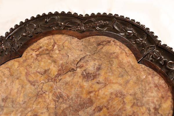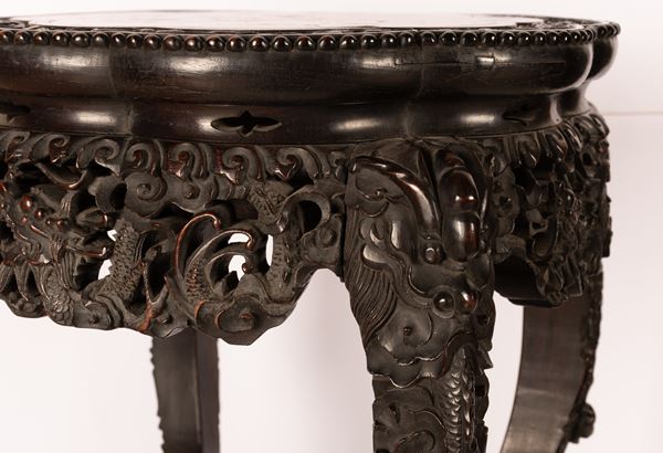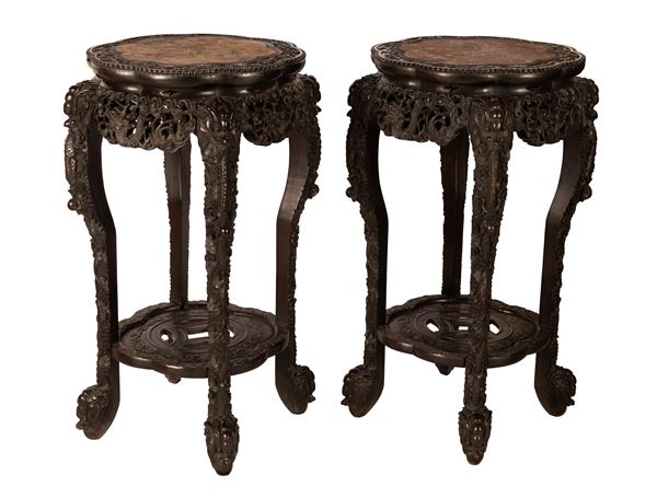 Coppia di antichi piedistalli cinesi in legno esotico con base in marmo con quattro piedi raccordati da piano inferiore intagliato.