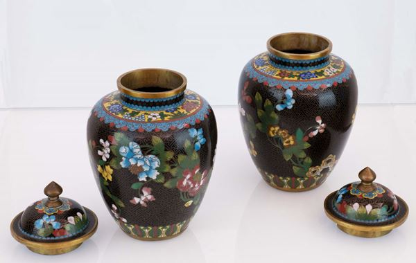 Coppia di vasi cloisonnet con coperchio. Cina, XX secolo
