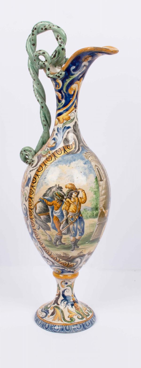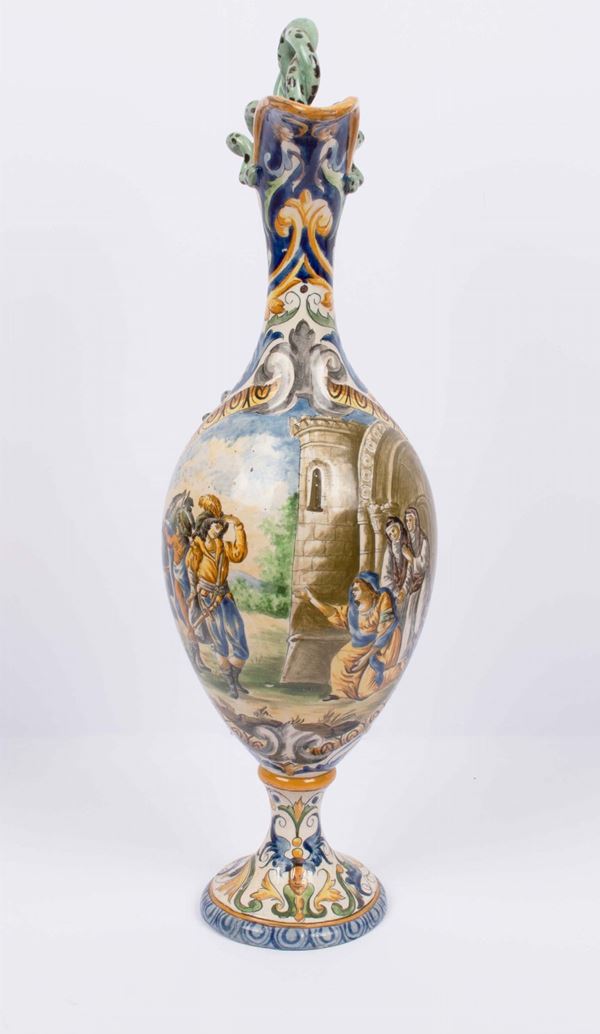 Grande anfora in maiolica con ansa serpentiforme e con decoro a grottesche di gusto rinascimentale. Manifattura Napoli Gaetano Battaglia, XIX [..]