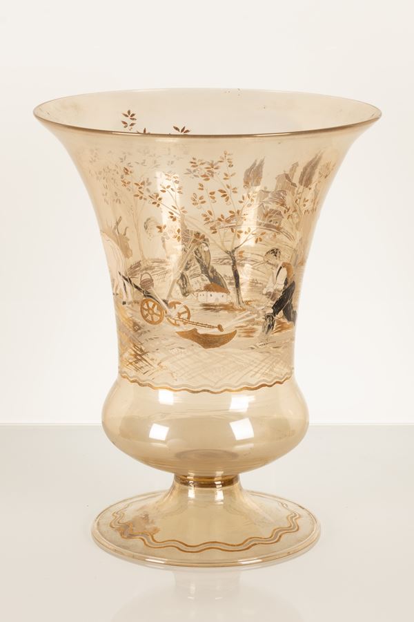 Grande anfora in vetro con scene bucoliche in oro e manganese