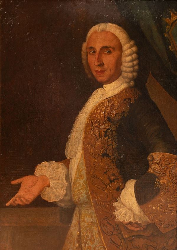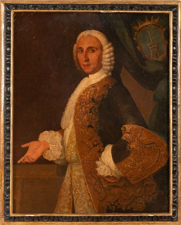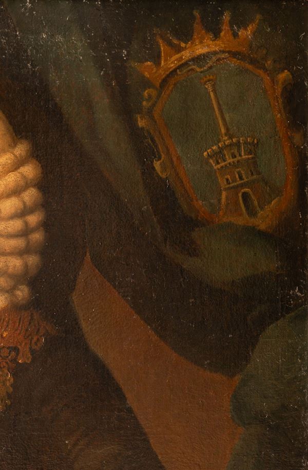 Campeggia a destra su un tendaggio verde un grande stemma araldico con torre sovrastata da colonna ardente