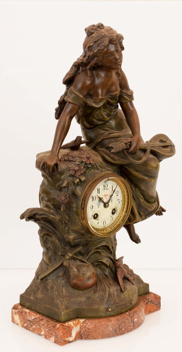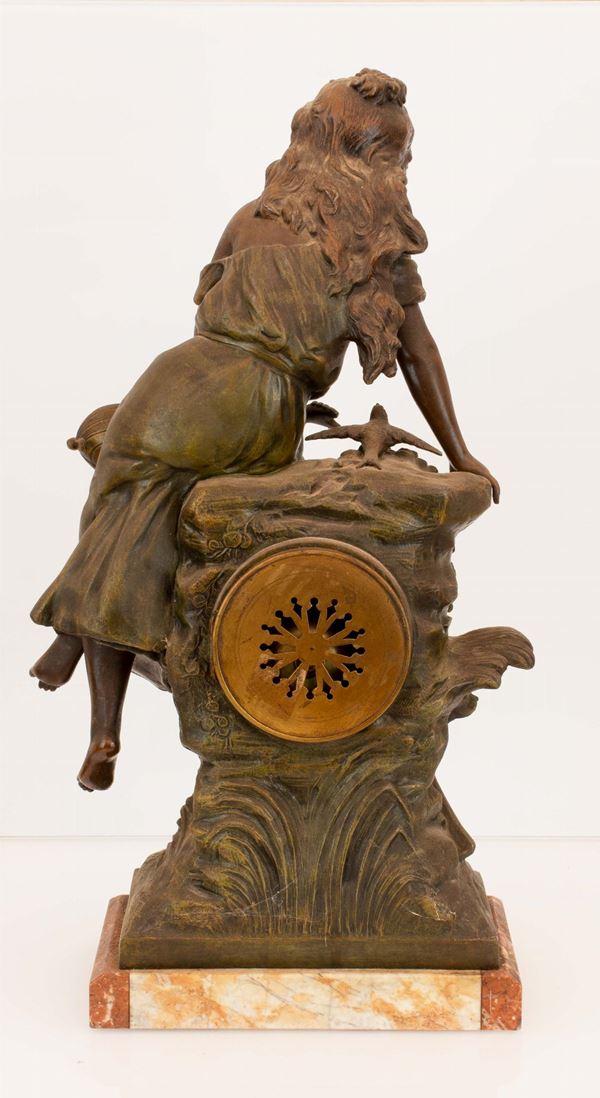 Orologio francese in bronzo da tavolo e marmo rosso rappresentante allegoria della musica Manifattura L & F Moreau