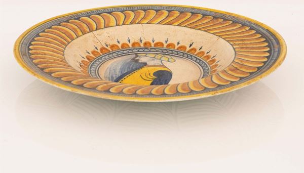 Piatto in maiolica con decoro della tesa a finte baccellature e al centro del cavo un ritratto virile posto di profilo. Manifattura area umbro-laziale [..]