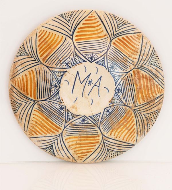 Tutto il retro del piatto è decorato al bordo con un motivo alternato fogliato in blu e manganese terminante con piccoli asterischi blu, mentre al centro campeggiano in caratteri capitali blu su fondo bianco le lettere M A divise a loro volta da un asterisco.