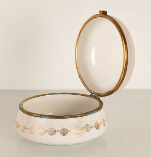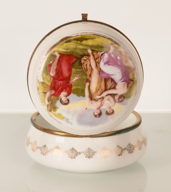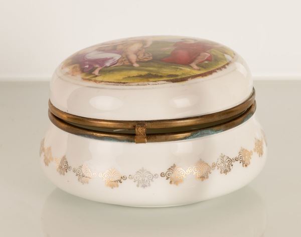 Portagioie in opalina. Coperchio decorato con scena dal Giudizio di Paride