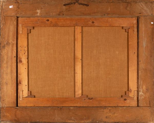 cm 93x128,5; con cornice cm 133x167Cornice in pioppo a cassetta del XVII secolo laccata nera con decori in oro a girali di pampini e uva