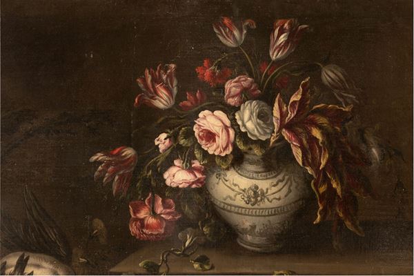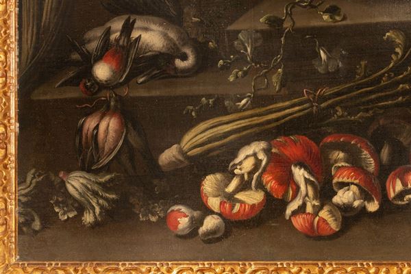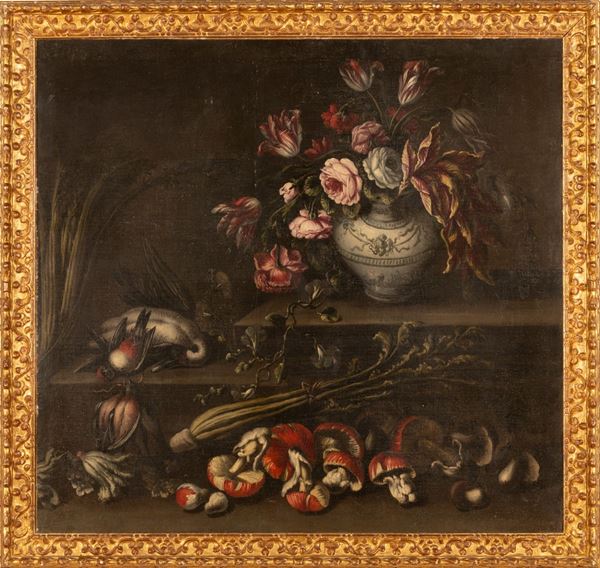 Natura morta con vaso di fiori, funghi, ortaggi e cacciagione