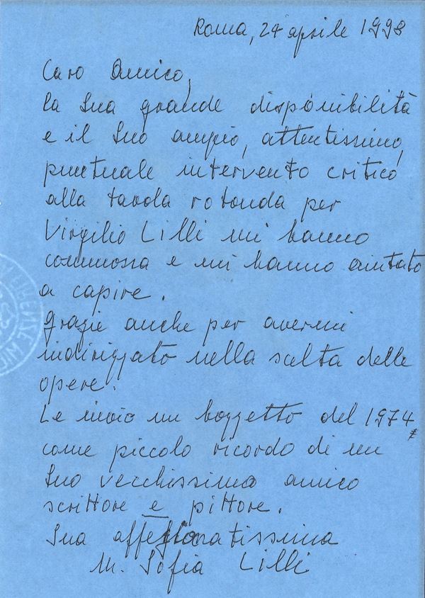 la Sua grande dispomibilità e il suo ampio, attentissimo, putuale intervento critico alla tavola rotonda per Virgilio Lilli mi hann commossa e mi hanno aiutato a capire. Grazie anche per avermi indirizzato nella scelta delle opere. Le invio un bozzetto del 1974 come piccolo ricordo di un suo vecchinssimo amico scrittore e pittore.