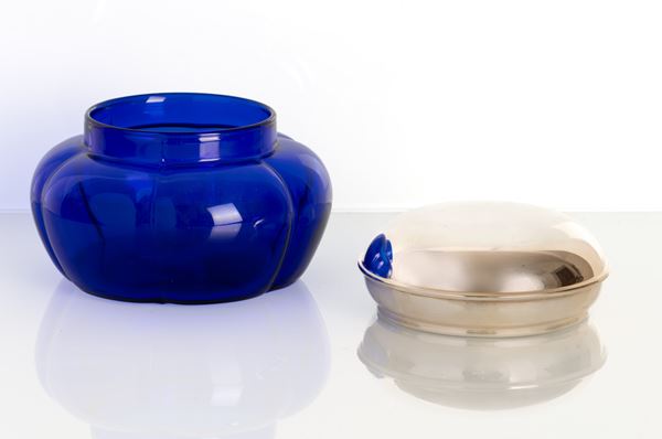 Contenitore in vetro blu con coperchio in argento 800/000. Punzone 885FI