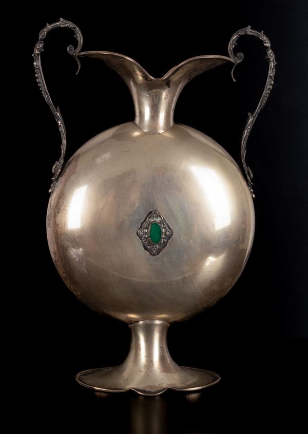 Grande vaso in argento con pietre verdi incastonate sul fronte e sul retro. Straordinario decoro a racemi sia inciso che a rilievo.