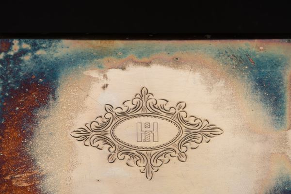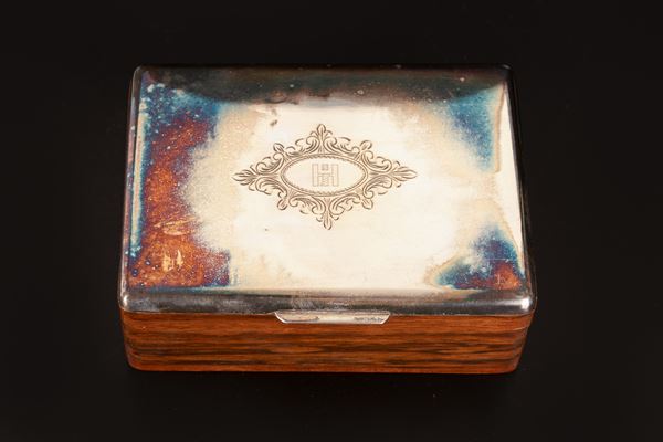 Scatolina in legno d'ulivo con coperchio rivestito in argento 800/000 incisa nella parte centrale con motivo floreale e monogramma