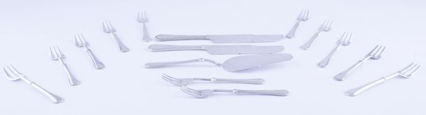 Servizio di posate silver plated con marchio E.R. ZIRO composto da paletta per torta, 2 coltelli da marzapane, 12 forchettine da dessert