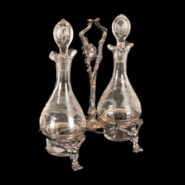 Set olio e aceto Art Nouveau in metallo in bagno d'argento e vetro. Francia, prima decade del Novecento.
