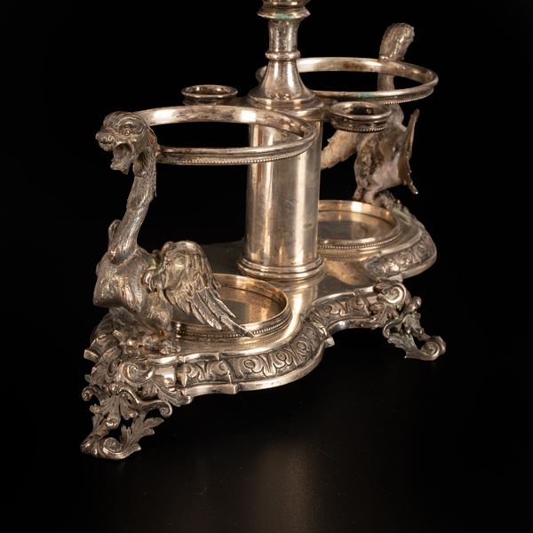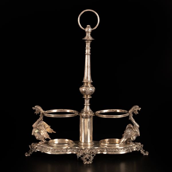 Set olio e aceto senza bottiglie di foggia baroccheggiante, finemente lavorato, con alle due estremità sculture a tutto tondo rappresentanti [..]