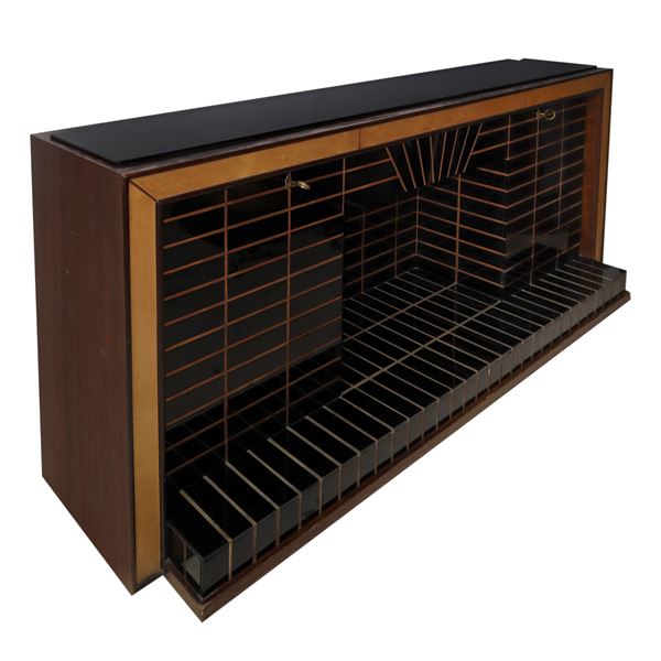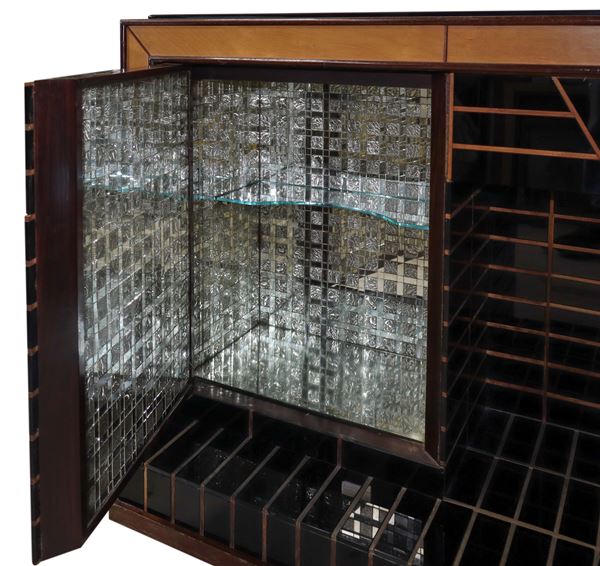 cm 255x170x44Fronte decorato da vetro di Murano. Piastrelle separate da listelli di legno d'acero.