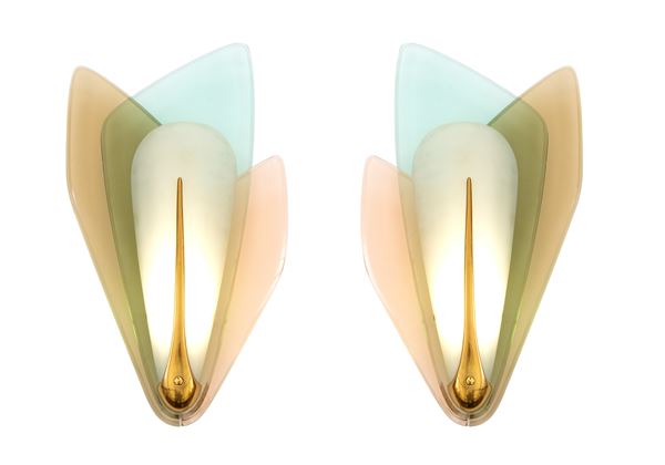 Coppia di lampade da parete con struttura in ottone e vetri sagomati colorati