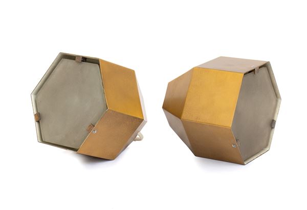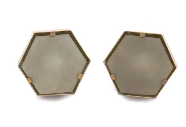 Coppia di lampade da tavolo con struttura esagonale in ottone e diffusori in vetro satinato. Modello 2202
