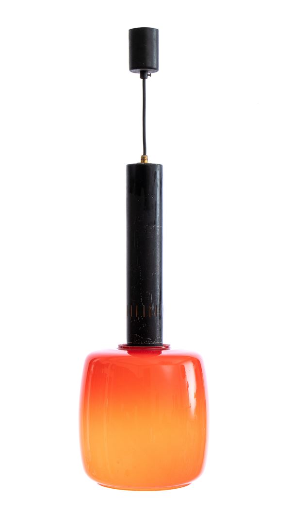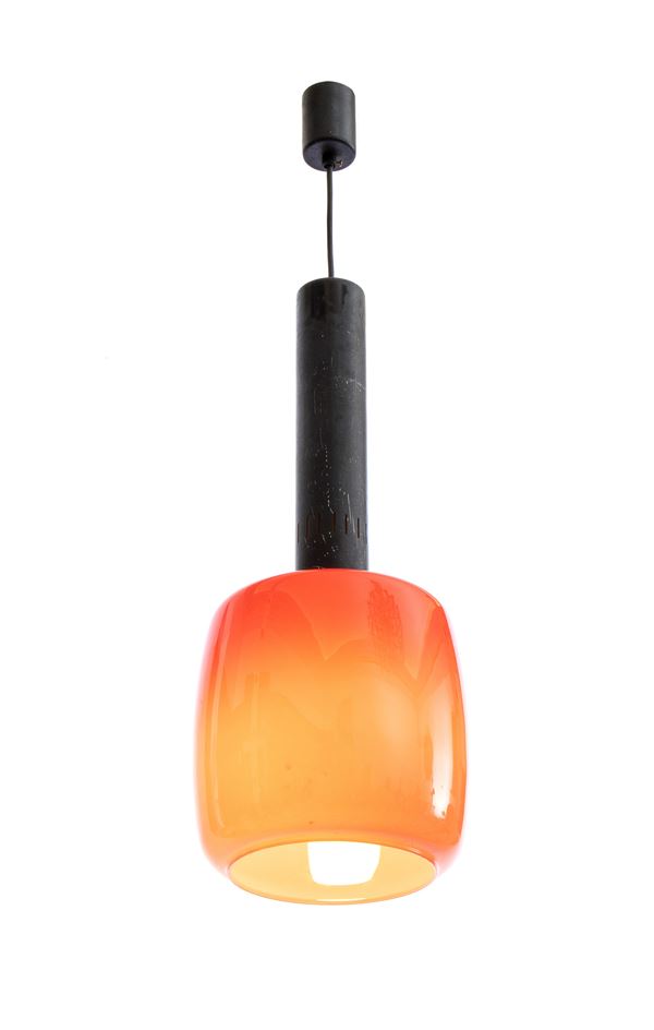 Lampada a sospensione con struttura in ottone e metallo. Diffusore in vetro colorato