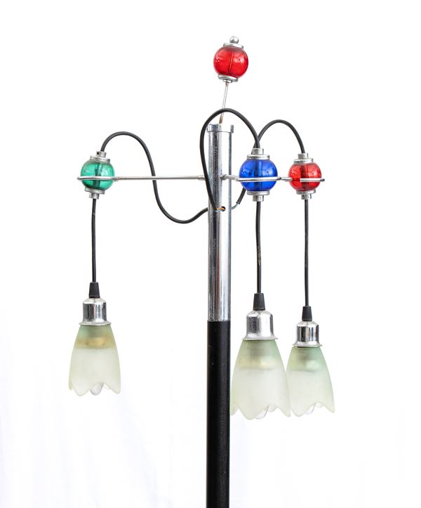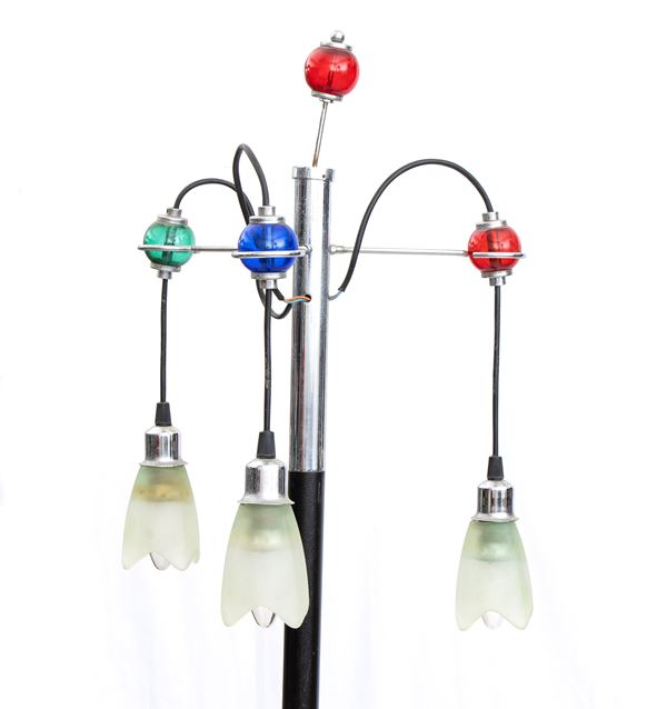 Lampada da terra in metallo laccato a tre luci con inserti sferici in vetro colorato