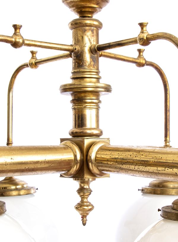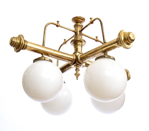 Lampadadario a quattro fiamme in ottone e diffusori in vetro opalino