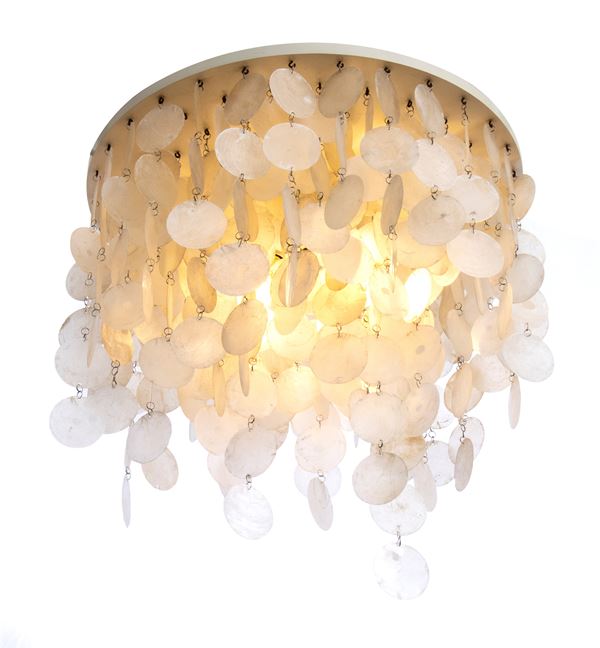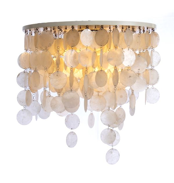 Lampadario a plafone, di grandi dimensioni con struttura tonda in alluminio con finitura e giri di catenelle e pendenti in piccoli dischi di [..]