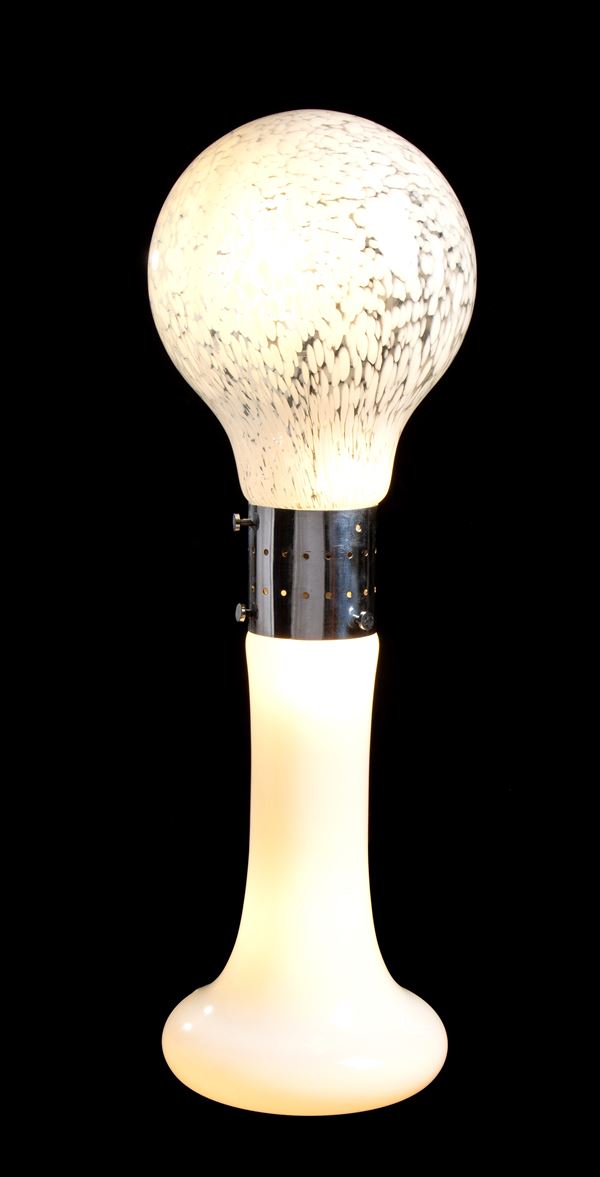 Lampada da terra Birillo composta da vetri soffiati di murano e cilindro cromato
