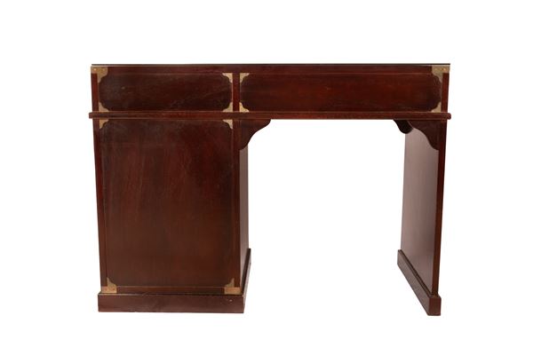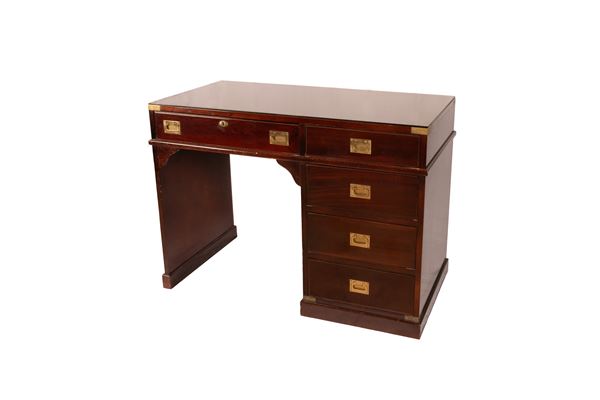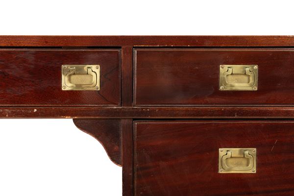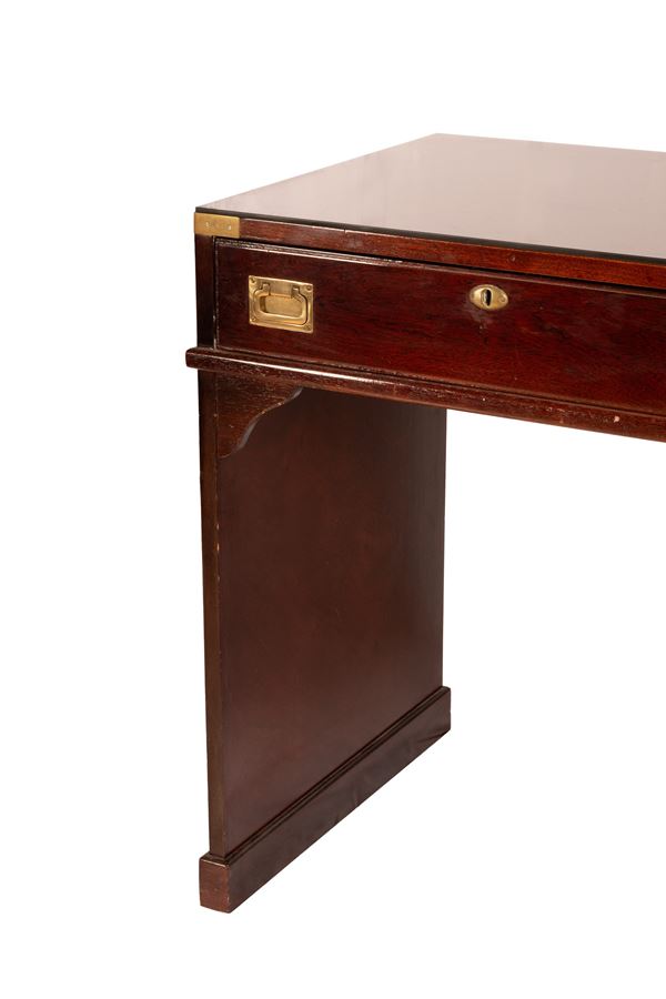 Scrivania stile marina modello Byron in mogano con cinque cassetti sul fronte e piano con vetro