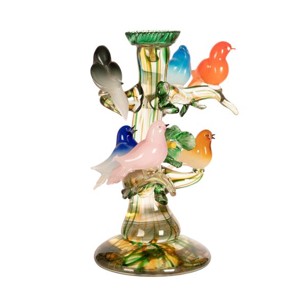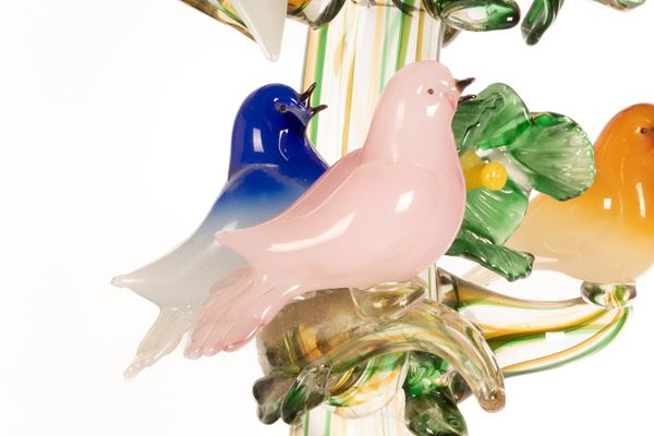 Scultura in vetro soffiato raffigurante 6 uccelli su un albero