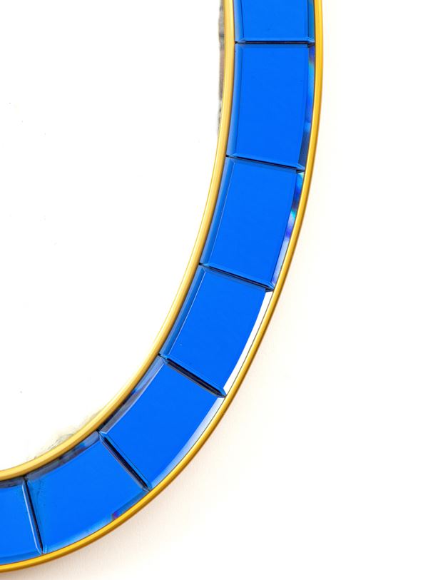 Specchio ovale con cornice di cristallo blu sagomata a mano, doppio bordo in ottone.