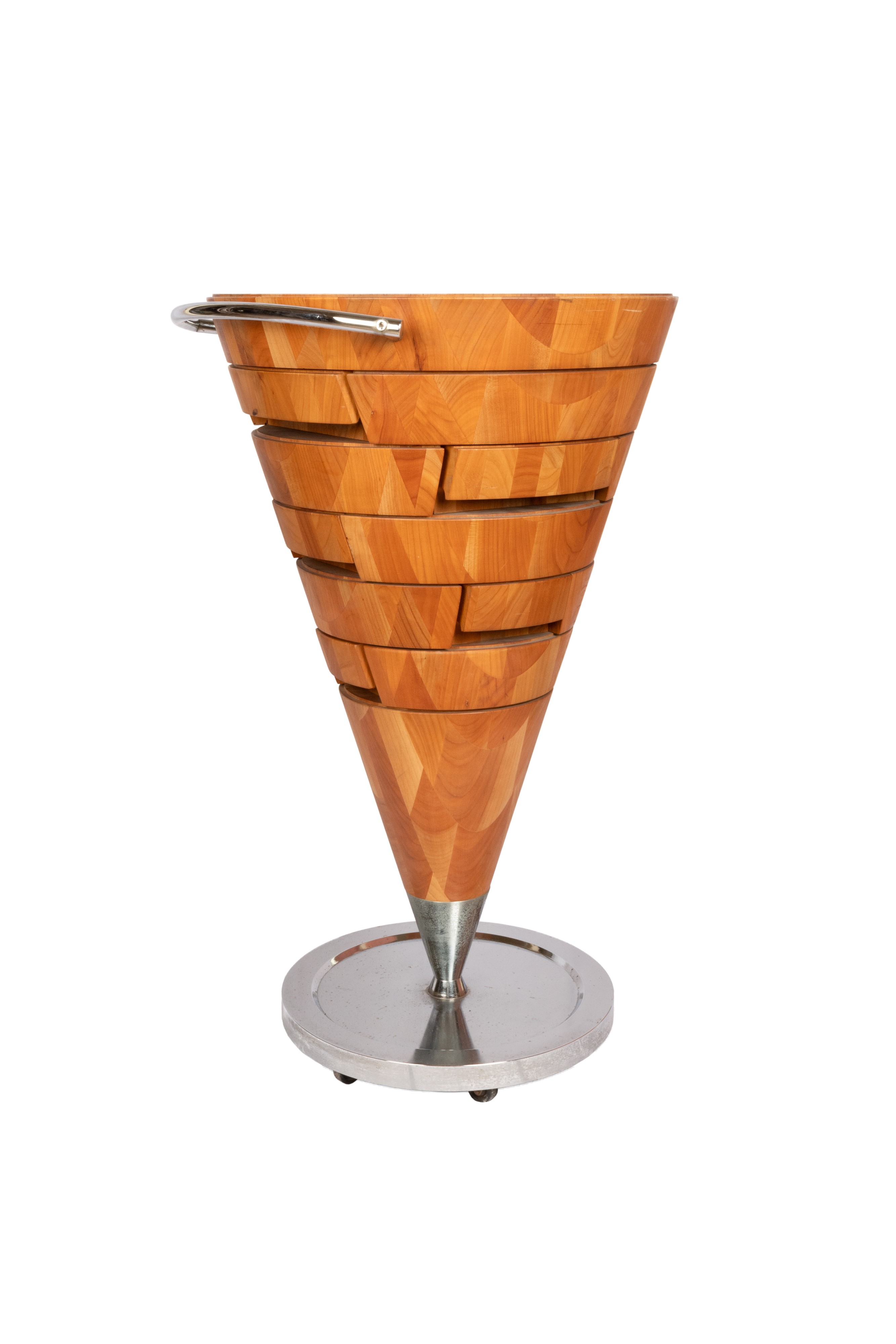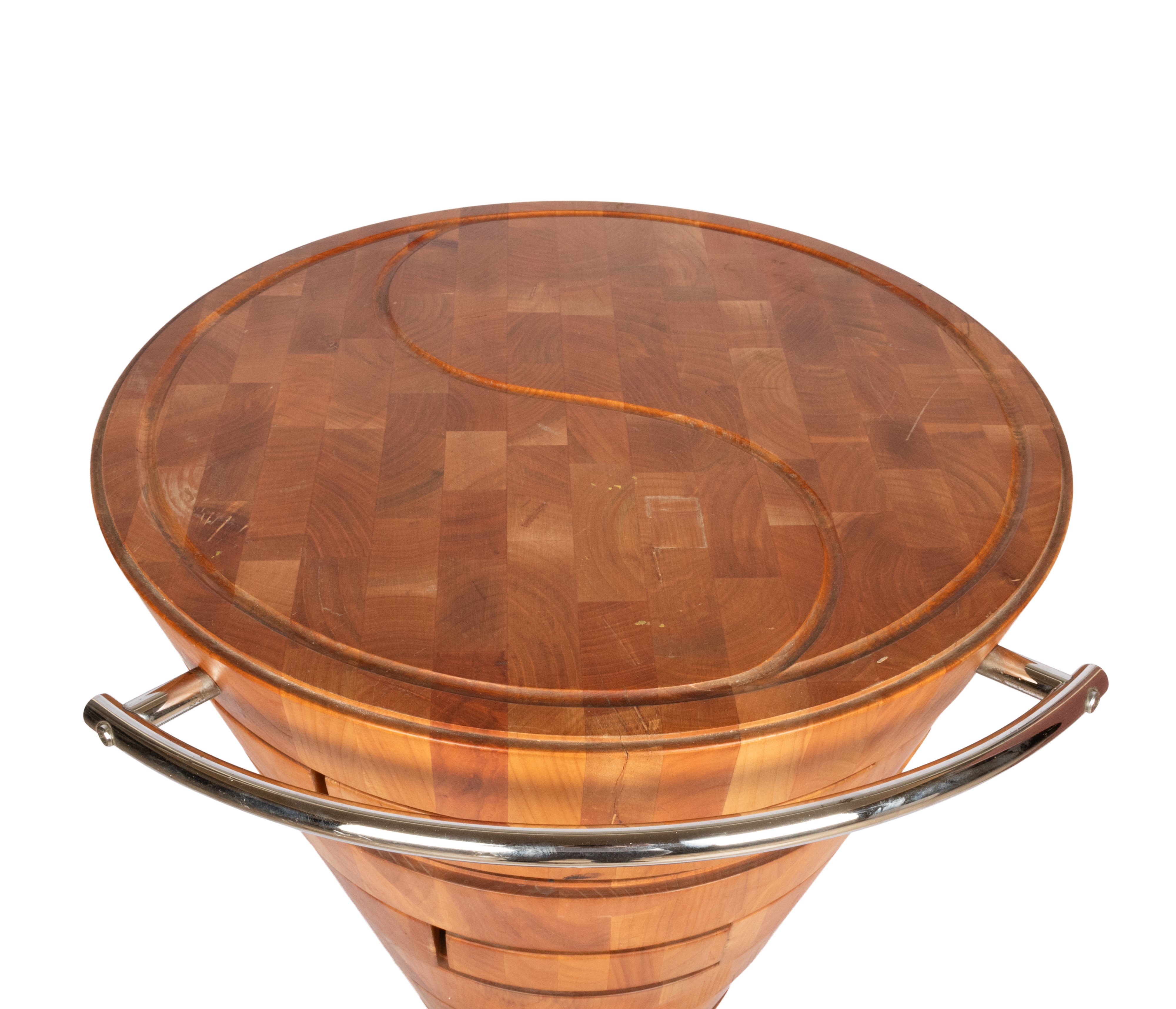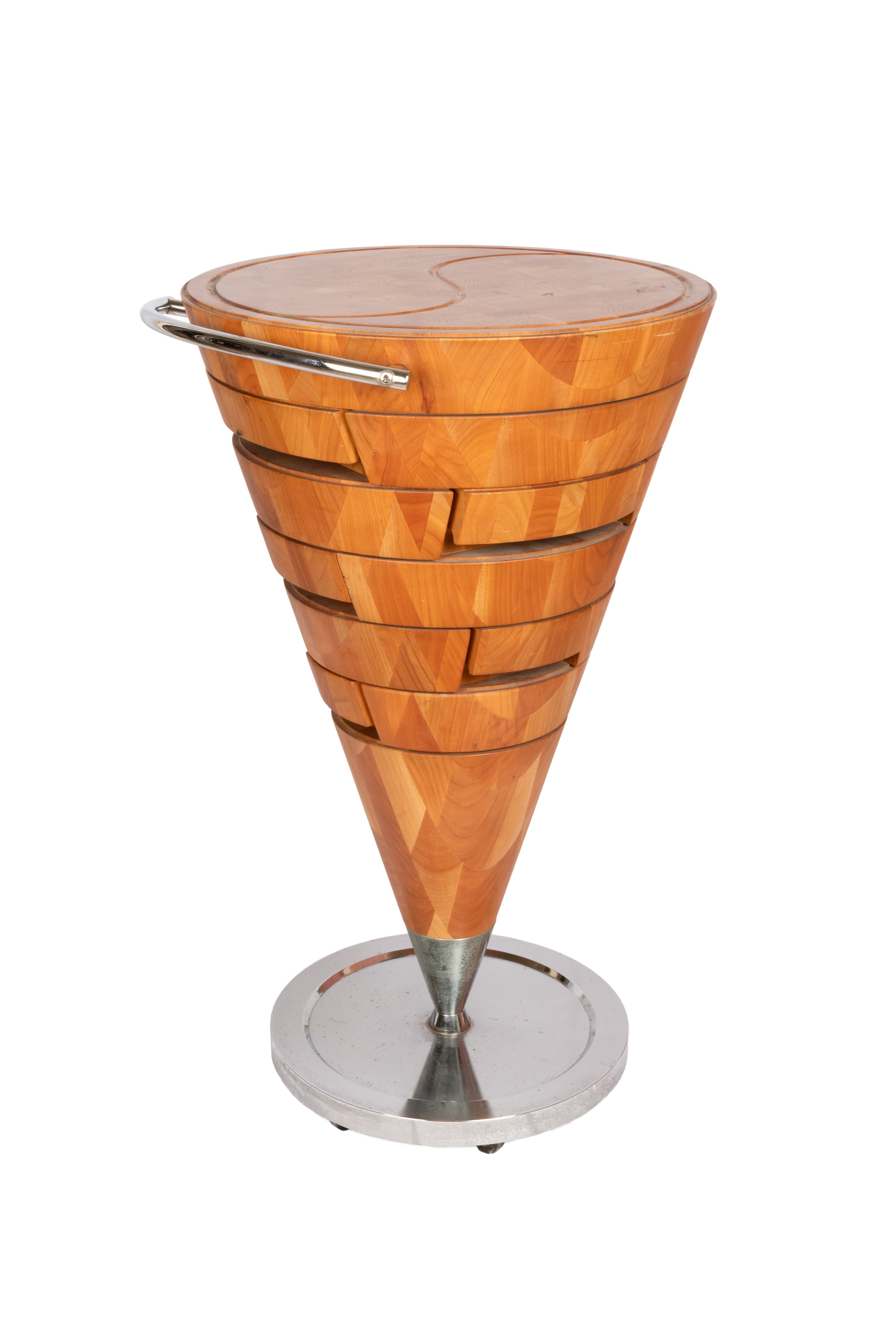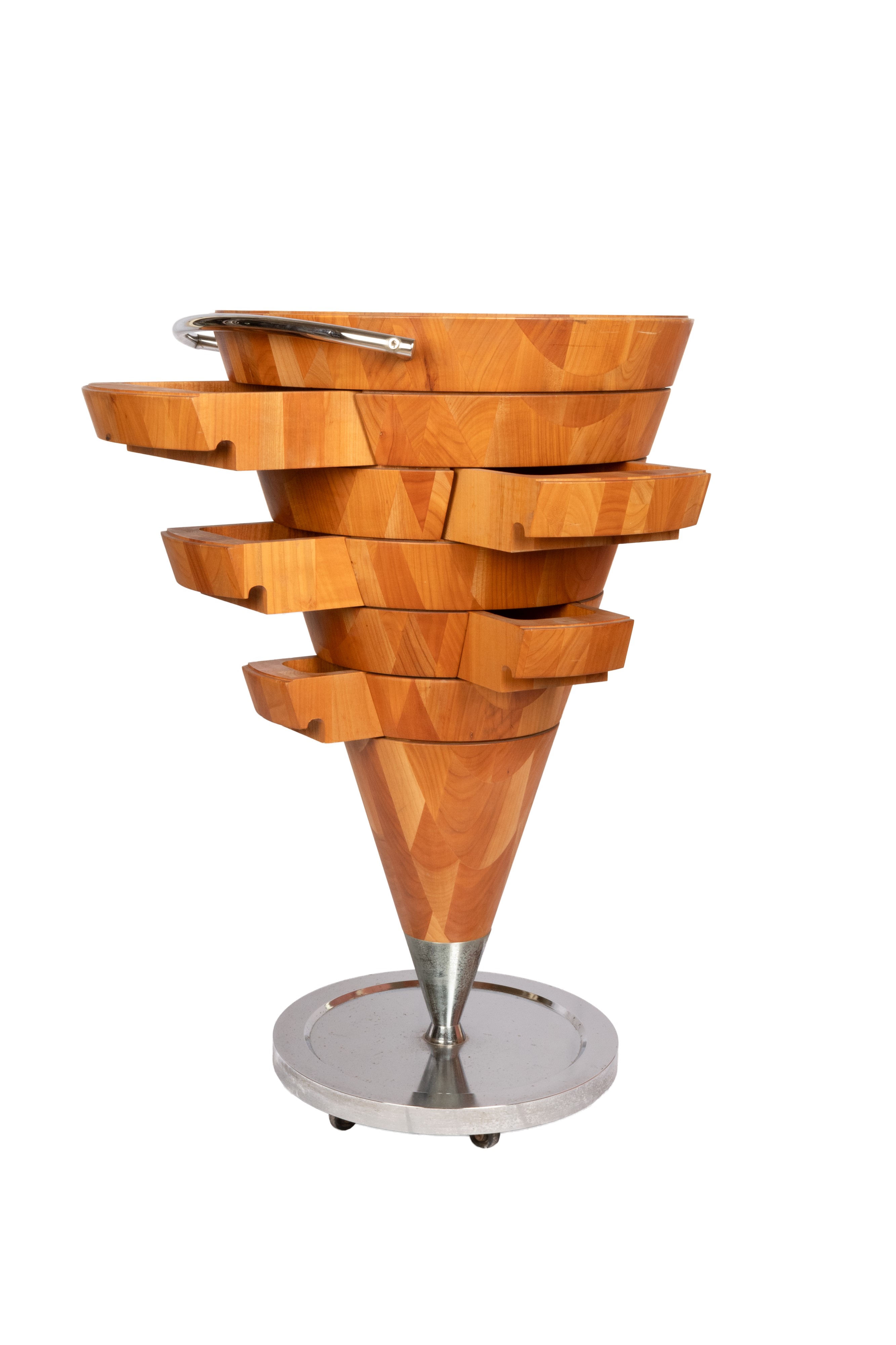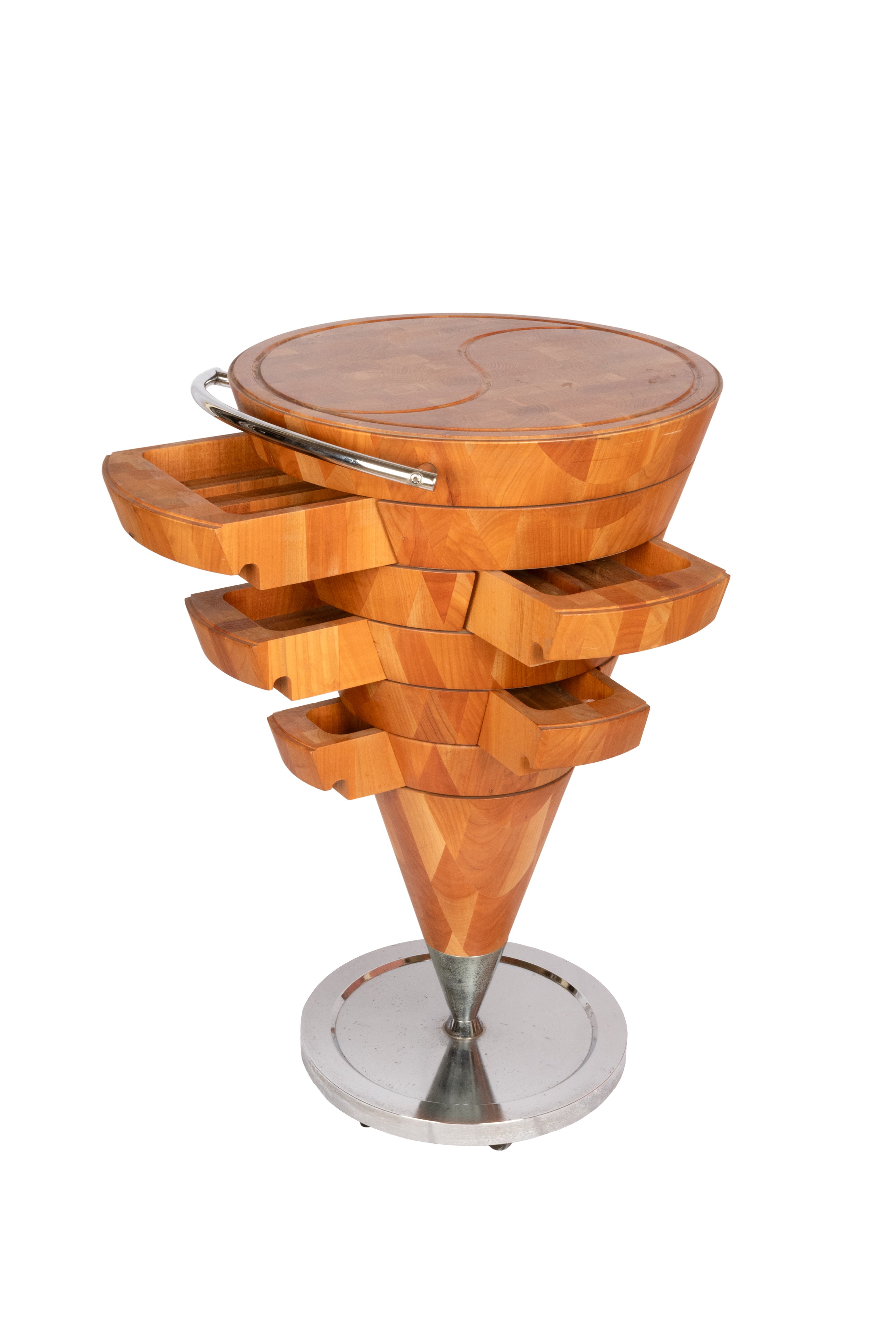 Tavolino da appoggio in legno con cassetti a scomparsa e base in acciaio