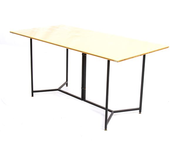 Tavolo rettangolare con struttura in metallo e piano in legno e vetro