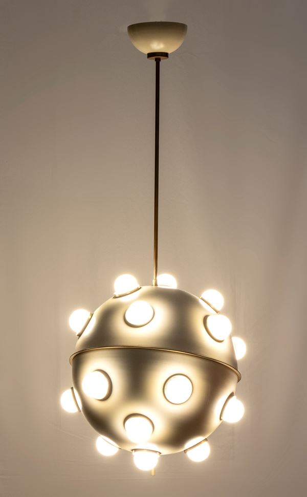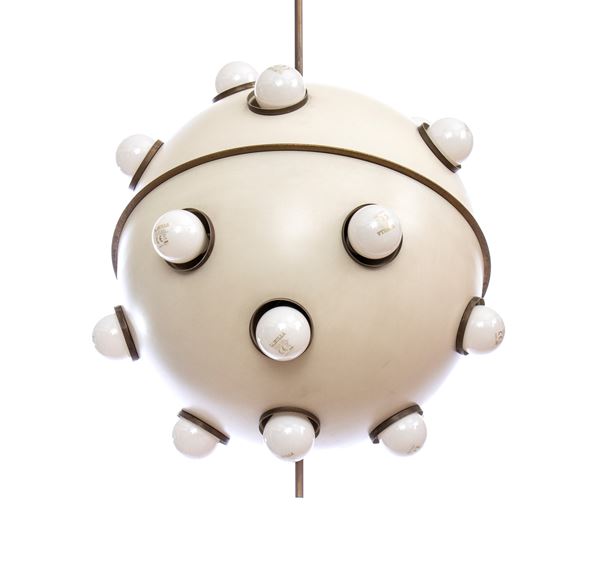 Lampada a sospensione mod. 551 in metallo smaltato, elementi in ottone.