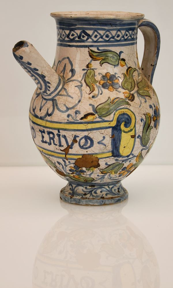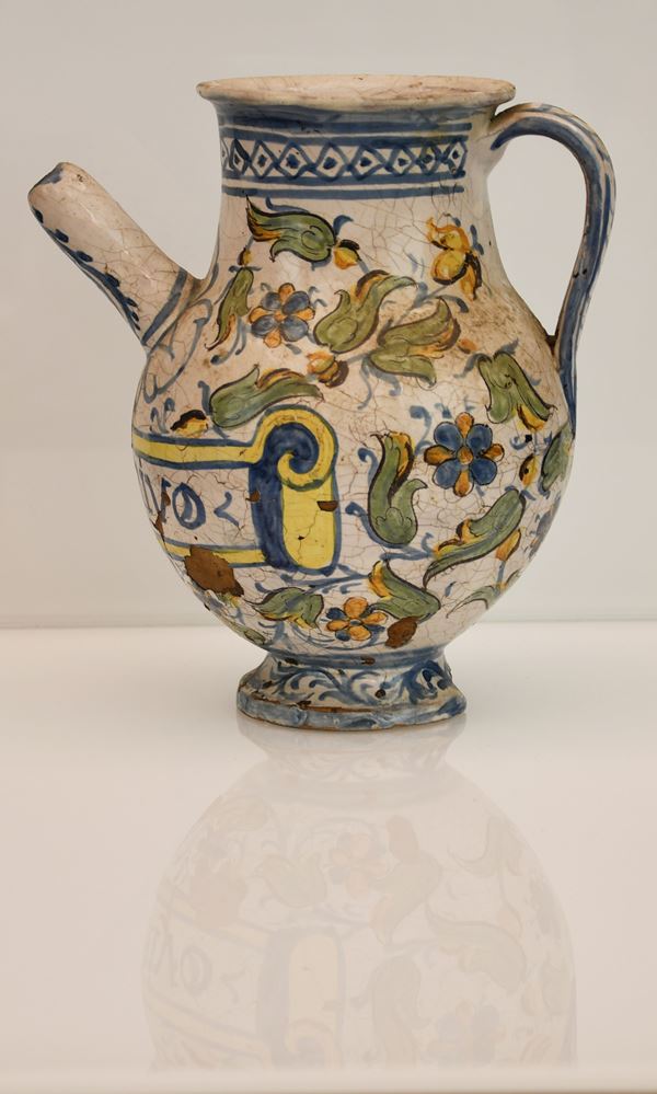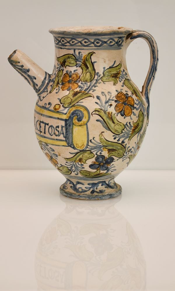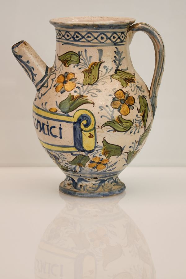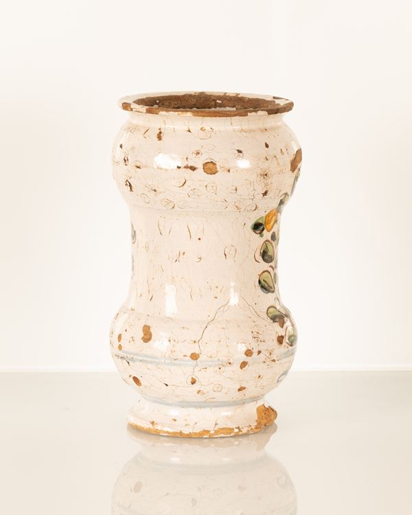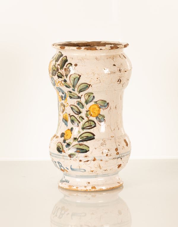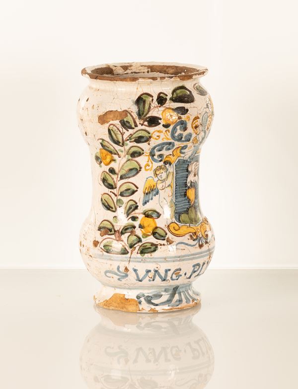 Albarello da farmacia decorato con due serti fioriti stante ad incorniciare un blasone sorretto da due angeli con al centro un'aquila che becca [..]