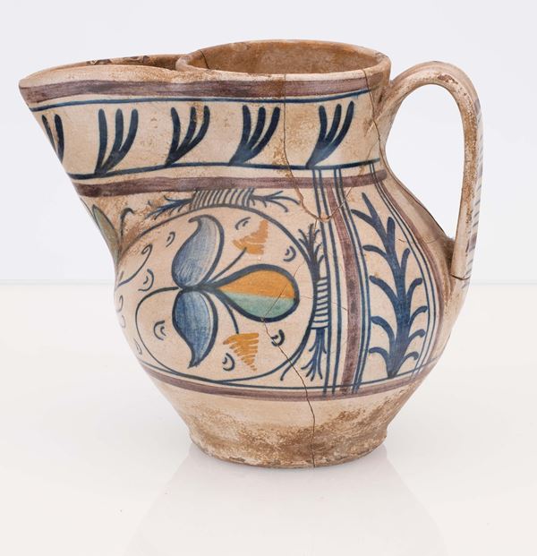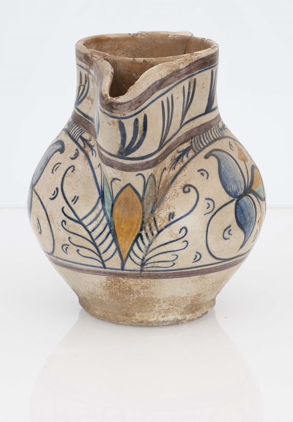 Boccale in maiolica con motivo vegetale a palmetta e a dente di lupo. Manifattura dell'Italia centrale (Umbria o Lazio) fine del XV - primi [..]